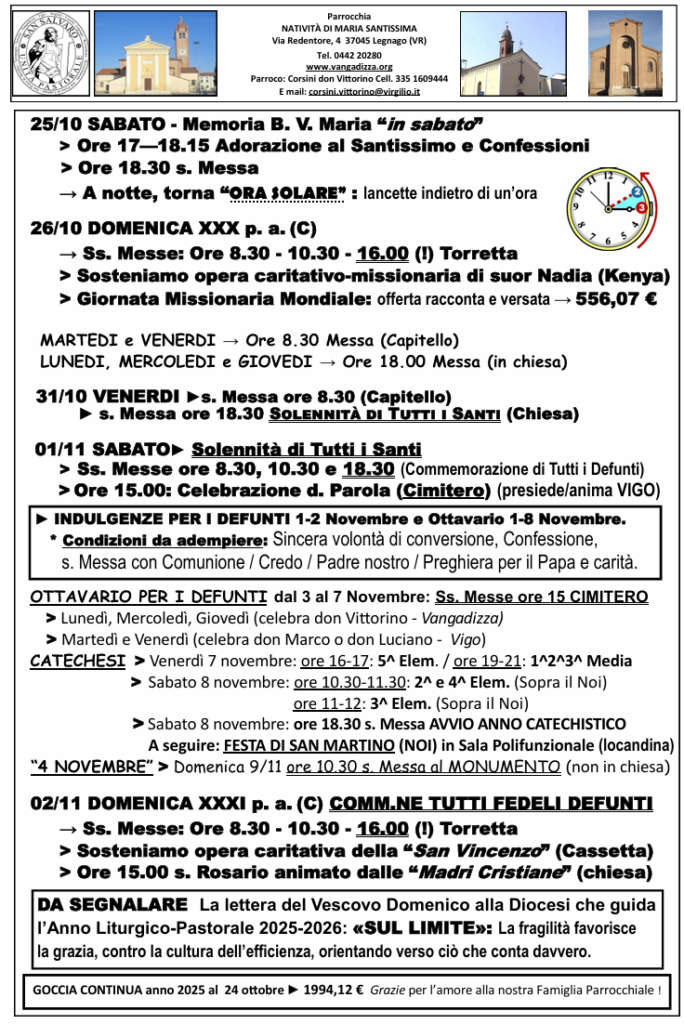 Orari S. Messe Nov 28, 2024Ott 27, 2025 Lunedì ore 18.00 Martedì ore 8.30 (Capitello) Mercoledì ore 18.00 Giovedì ore 18.00 Venerdì ore 8.30 (Capitello) Sabato ore 18.30 Domenica ore 8.30 , ore 10.30